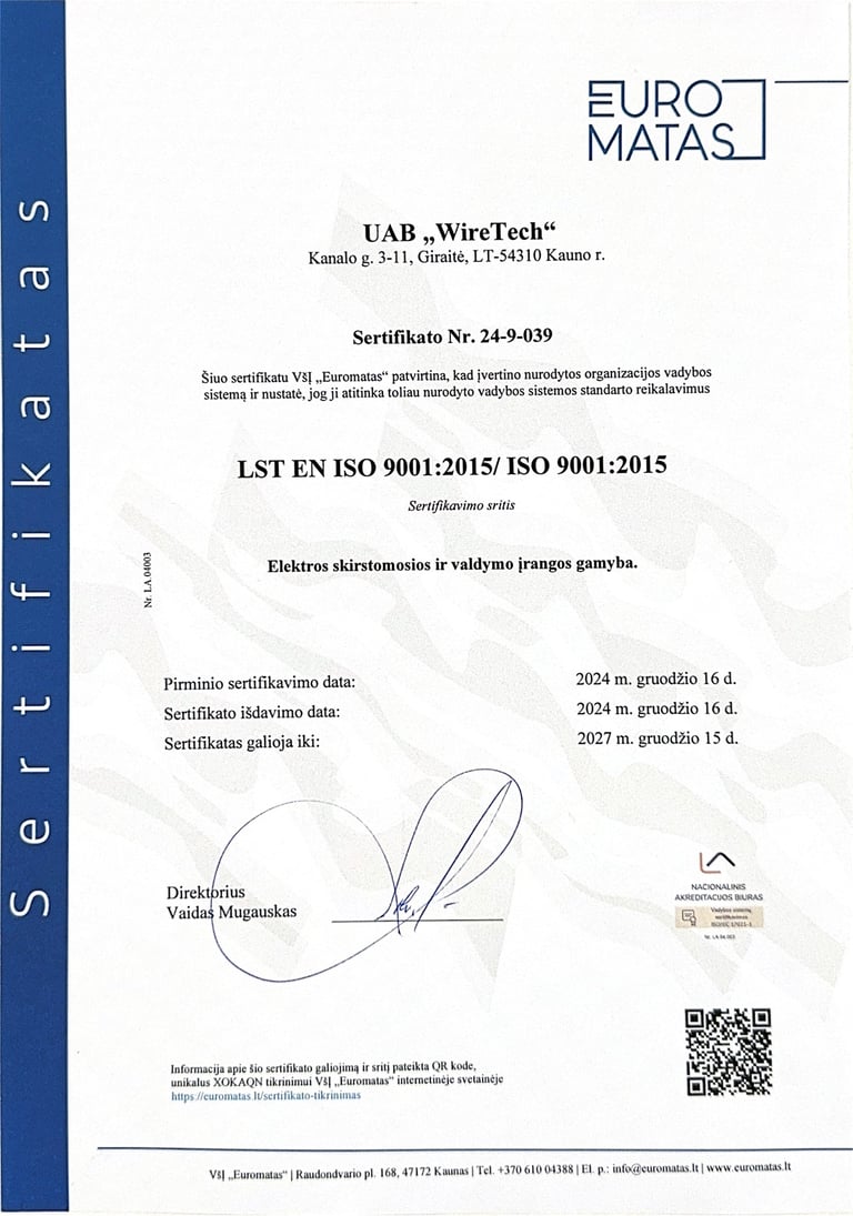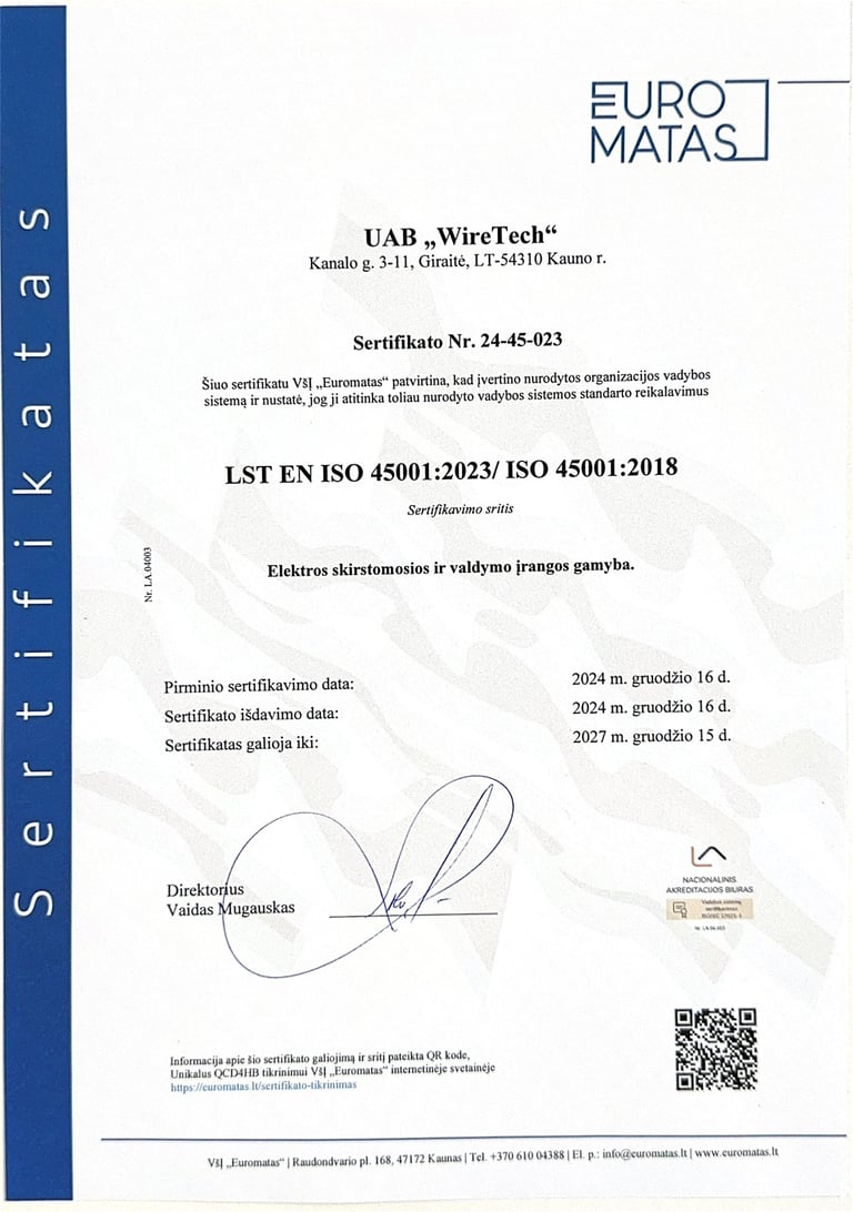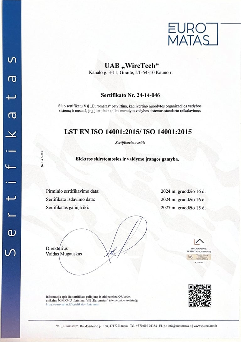 Компания Wiretech имеет сертификаты, которые подтверждают, что наша деятельность соответствует стандартам системы управления качеством, системы экологической безопасности и системы управления охраной труда и безопасностью. Мы постоянно совершенствуем свои навыки, чтобы предложить нашим клиентам надежные и эффективные решения.
